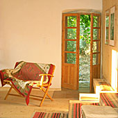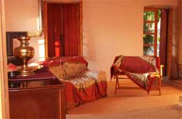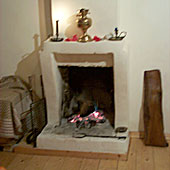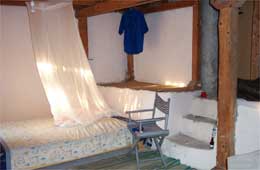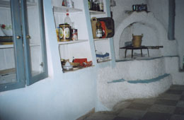 above: living area upstairs. kamine on the right. left: kitchen with fireplace. right: summer sleeping place downstairs. possible: kitchen and living area.